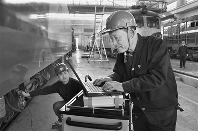 太原铁路局太原机务段轴检组工长郝文珍和徒弟正在对承担春运任务的火车头轴箱轴承进行检测。