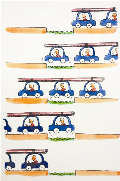 现在,您与我还有夏明先生,是三辆车的司机。摆在我们三人面前的困难是,凭我们自己的条件,谁也过不去这条河。此刻,一根硕大的圆木和一项创造性建议让我们摆脱了困境,于是我们很大胆、很奇妙地,无一例外地到达了对岸。