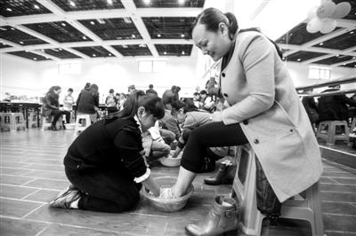 1月15日,在海南青少年活动中心,百名“贴心小棉袄”现场为父母洗脚揉肩、制作平安福袋。这是共青团海口市委举行“领巾飞扬 缤纷冬日”公益冬令营之“贴心小棉袄”活动。