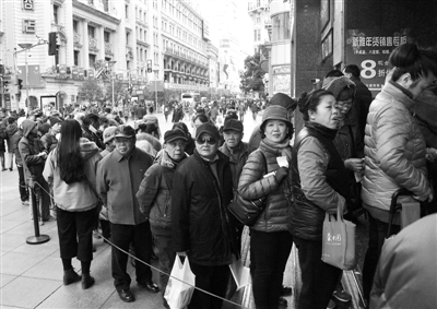 1月23日,上海,临近春节,上海一些老字号推出的年夜饭套餐和半成品菜肴,深受广大市民的青睐和追捧。当日,在南京路新雅粤菜馆门前,购买半成品菜肴的市民在寒风里大排长龙。据介绍,这几天年夜饭套餐销售接近高峰,每天的供应量直线上升。小盒装的半成品,可以按菜的品种购买,按需求组合出自家的年夜饭。
