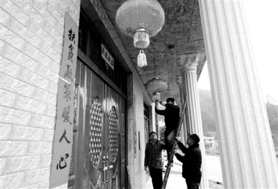 1月18日,在江西九江修水东港乡,南昌铁路局九江桥工段扶贫驻点干部在帮脱贫农民挂灯笼。