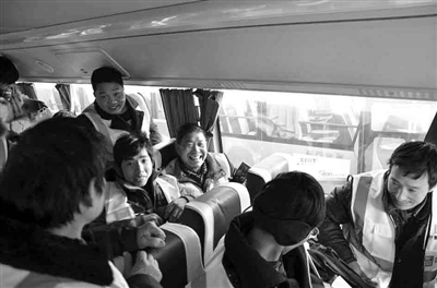 1月20日,中建二局三公司的42名农民工坐上公益大巴回乡。(秦笑语)
