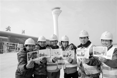 1月20日,中建三局天河机场三期项目安装工程的工友人手一张明信片。 明信片正面是他们各自与天河机场T3航站楼的合影。