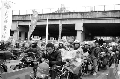 1月13日上午9时,“返乡摩骑”队伍正在排队加油,准备出发。 本报记者 刘友婷 摄