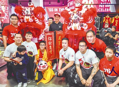 1月24日,林书豪(后中)与舞狮队演员合影。