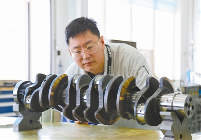 鹿新弟在检查柴油机曲轴。