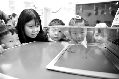 山东聊城大学美术学院大学生最近来到聊城市翰林苑幼儿园,向小朋友们展示自己设计制作的3D全息投影仪,让孩子们近距离观看“地球”“海底世界”“钢铁侠”等3D影像,感受科技魅力。图为小朋友们看得既投入又兴奋。