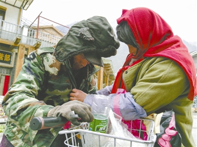 《老伴》 1月26日,在四川映秀镇,一对老年夫妻买完春联后,老太太帮老爷子系好衣服扣子。 王程 摄