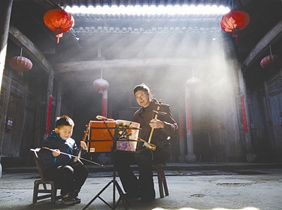 《传承》 1月27日,浙江省临安市岛石镇岛石村,孙子跟爷爷在古祠堂内学拉京胡。胡剑欢 摄