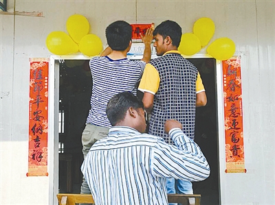 《贴春联》 1月27日,中铁大桥局孟加拉帕德玛大桥项目部,中外员工一起欢度中国年。占传国 摄