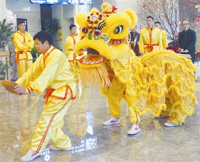 高树堂舞狮队在惠州一家酒店内舞狮。 本报记者 刘友婷 摄