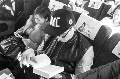 1月23日,从北京开往安徽的高铁上,一名乘客在春节回家路上专心看书,以此度过5小时的回家旅途。