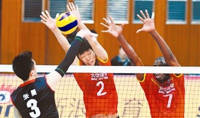 2月5日,北京队在男排联赛半决赛第一场比赛中以3比0战胜四川队。图为四川队球员张晨(3号)扣球。