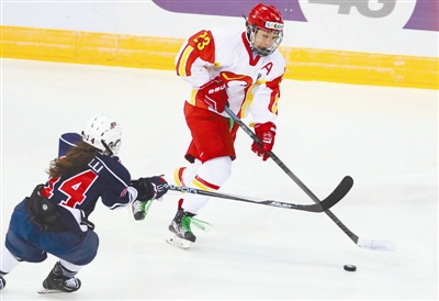 2月6日,中国队球员方新(右)在比赛中突破。当日,在第28届世界大学生冬季运动会女子冰球季军战中,中国队以0比3不敌美国队,获得第四名。新华社记者 孟永民 摄