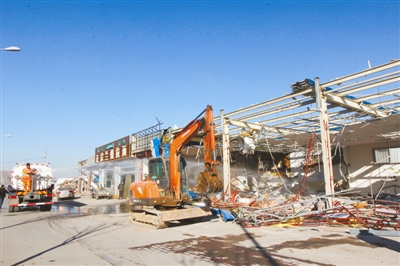 工作人员在济南中央商务区拆迁片区内拆除建筑(2015年12月17日摄)。
