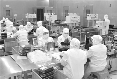 江苏海安是全国条斑紫菜养殖加工出口示范区之一,其中的南黄海紫菜城年销售干紫菜15万箱,成交额近6亿元,吸引周边5000多个劳动力就近就业。图为江苏省南通市海安兰波实业公司条斑紫菜二次加工生产线正生产出口欧美市场的紫菜。