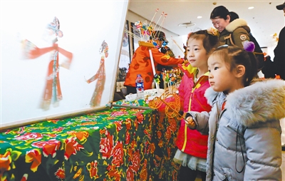 2月8日,小朋友在非遗展演活动上观看皮影戏。