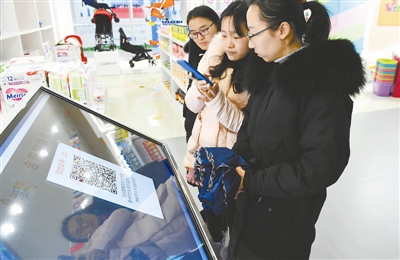 2月8日,顾客在中国(合肥)跨境电商综合试验区进境商品展示体验中心内选购完进口商品,通过扫描二维码的方式付款并填写收件地址。