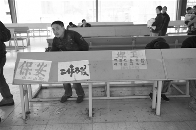 2月6日,在成都市三环外的一家人才市场,农民工扛着行李早早来找工作,一些没有特别技能的农民工打出“工作不限”字样,寻求更广泛的工作机会。 莫晓 摄/视觉中国