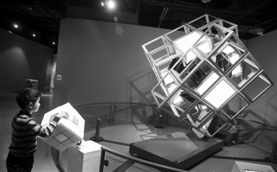 近日,由魔方之父厄尔诺·鲁比克参与打造的“超越魔方”科技互动展览在上海环球港博物馆举办,24件创意交互展品让观众充分体验了魔方的魅力以及魔方在艺术、时尚、科技、设计等领域的跨界影响力。图为一名小观众在展馆内体验玩转半吨重的巨型魔方的乐趣。