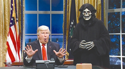 当地时间2017年2月4日,美国纽约,众星出演《周六夜现场》。“特朗普总统”身后站着一个“隐形总统班农”,他在催促特朗普给世界多国领导人打电话。东方IC供图