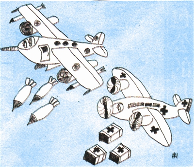 入侵者依仗着精良武器妄图称霸,他们将成吨的炸弹投向手无寸铁的平民、学校、医院,随之又向受害者伸出“援助”之手……看,强盗的两面手法何等歹毒!