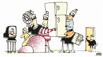 表现球迷上瘾如痴的漫画甚多,像这位先生与贼共赏绿茵激战的却是少见。情节出乎人们的预料,却在情理之中。画面中那位刚刚进门者似乎多余了。【西班牙】阿菲罗