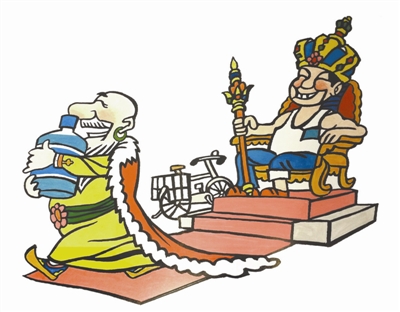 从情节上看,漫画《一桶江山》是一出充满荒诞元素的喜剧;从情感上看,这幅作品传达的信息更具悲剧色彩。送水工一桶水,换来国王拥有的整个江山。人们不禁要问:天下竟有这样的交易,国王疯了吗?更让人费解的是,国王感觉自己赚了,以至连自行车都不要了。