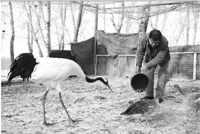林甸县林业局鸟类救助站,2016年共救助了丹顶鹤、白头鹤等9只国家一级保护动物,雕鸮、长尾林鸮等28只国家二级保护动物,而这个救助站只有付建国一个人。图为付建国在喂食救助的丹顶鹤与灰雁。张澍 摄 /视觉中国