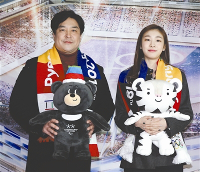 大图为韩国冰雪运动员手持平昌冬奥会火炬亮相,小圆图为韩国花滑名将金妍儿手持平昌冬奥会吉祥物白老虎“Soohorang”为此次庆祝活动助阵。