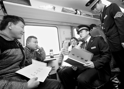 2月12日,在阜阳开往上海的K5551次列车上,乘务人员将含有机械、电子、超市以及物流等不同行业的务工信息资料发放给列车上的乘客。