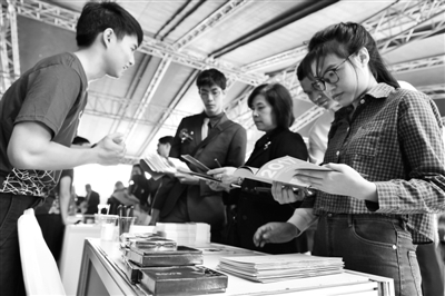 2月11日,在泰国曼谷,泰国中学生和学校代表在江苏大学宣传展位上查看招生简章。首个由中泰两国教育机构及企业联手搭建的跨国人才培养平台“中泰校企联盟”11日在曼谷成立,该平台将为驻泰中资企业定向培养专业技能及语言能力兼具的人才。新华社记者 李芒茫 摄