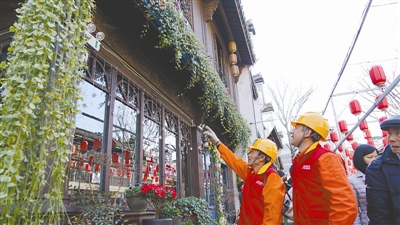 2月6日,浙江衢州供电公司员工在水亭街历史文化街区巡视检查配电箱和应急照明设备,确保整个灯会在元宵节期间亮亮堂堂。