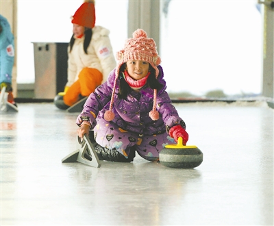 2月12日,一位小学员在体验冰壶运动。当日,在哈尔滨冰雪大世界冰壶体验馆内,24名儿童参加了一场冰壶体验活动。在专业冰壶教练的带领下,儿童们学习了冰壶的基本技术,并体验了“冰壶桌游”,对冰壶运动有了初步的认识。 新华社记者 王凯 摄