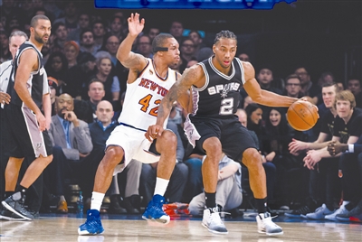 2月12日,尼克斯队球员托马斯(右二)在比赛中防守马刺队球员伦纳德(右一)。当日,在2016-2017赛季NBA常规赛中,尼克斯队主场以94比90战胜马刺队。新华社/美联