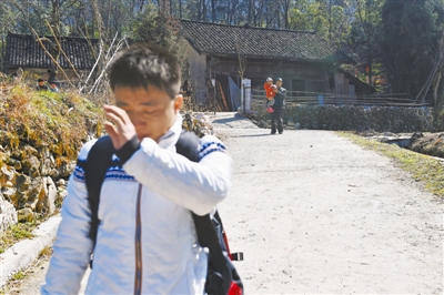 在60多岁的父亲和3岁的儿子的目送下,石欣抹着眼泪快步向村外走去(2月12日摄)。
