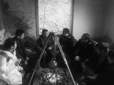 1月11日,本报记者方大丰(左三)、罗筱晓(左一)在湖南省浏阳市蕉溪岭防冻融冰监视哨采访,图为记者与工作人员围炉交谈。 李萍 摄