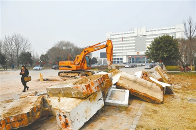 图为2月14日,在河南省清丰县县政府门口,大型机械正在拆除围墙。