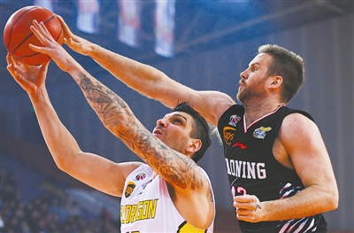 2月15日,CBA常规赛第36轮,北京农商银行队主场104比119负于辽宁队。图为北农队巴蒂斯塔(左)上篮。本报记者 许之丰 摄