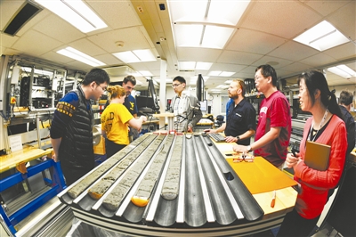2月15日,科学家在“决心”号岩芯室里工作。当日,在“决心”号大洋钻探船的岩芯室,科学家围在一起,对着刚刚切开的第三次南海大洋钻探第一管样品,热烈地讨论着。