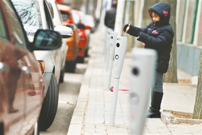 2月16日,一名小女孩在路侧指挥家长停车,其身边是新建好的北京路侧停车电子收费系统。