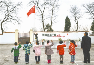 2月13日,重庆市南川区福寿镇农胜教学点的老师曾令柯和孩子们一起参加升旗仪式。