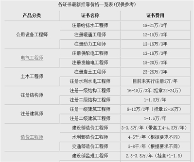 注册会计师,4万~4.5万/年(挂法人);注册一级消防工程师,8万/年;注册一级建筑工程师,8万~12万元/2年;注册岩土工程师,25万~28万元/3年……近日,一张名为“2016年各证书最新挂靠价格一览表”的表格流传网络,一些通过率低的资格证书挂靠费甚至超过一些职业的年均工资水平。