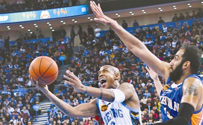 2月19日晚,本赛季CBA常规赛最后一轮比赛,北京队主场以113比114负于四川队,无缘季后赛。图为北京队40岁的马布里突破上篮。本报记者 许之丰 摄