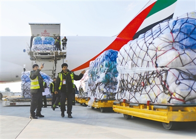 2月19日,在阿富汗首都喀布尔,工作人员在机场卸载中国援阿物资。