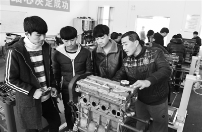 2月21日,学生在河北省阜平县职教中心梦翔汽车培训基地上实训课。2013年,阜平县职教中心与4家国内知名车企合作建成汽车培训基地,目前已输送学生1400余人。