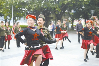 2016年11月15日,在福州市中心五一广场,一群潮妈跳着时下正走红全国的“水兵舞”。