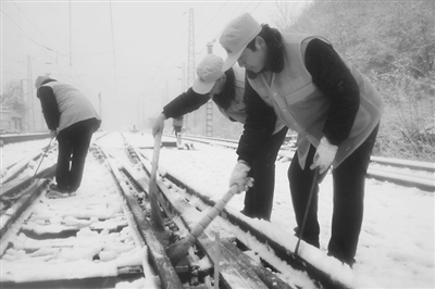 近日,郑州铁路局管辖的太焦线孔庄车站区突降大雪,车站自发组织28组道岔的除冰扫雪,确保旅客乘降安全和线路畅通。该站先后荣获“全国工人先锋号”“全国青年文明号”等称号。(郝丽红)
