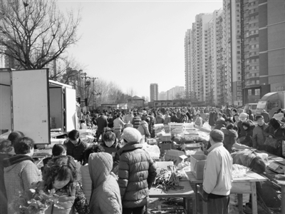2月13日,在紧邻北京市朝阳区八里庄东里旁的露天菜市场上,卖菜的商贩卖力吆喝着,周边买菜的居民熙熙攘攘,跟商贩们讨价还价。去年底,这个能够辐射周边几个社区的农副产品市场的建筑外围被拆除,而“固执”的商贩和周边居民还没有适应这处售卖点的突然消失,今年初开始,市场在露天的状态下,依然存在着。