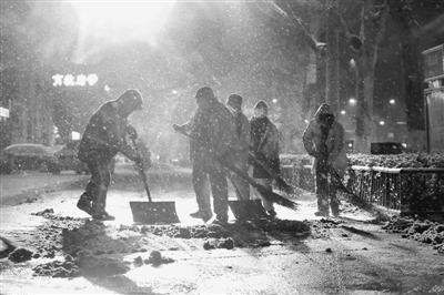 2月21日晚,山东省济南市普降大雪,气温骤降,在历山路附近,6名环卫工人组成一个班组在大雪中清扫积雪。